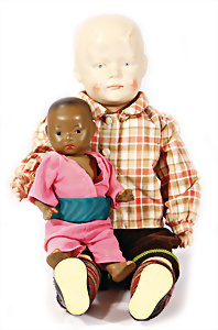 Konv. Celluloid, 5 Teile, farbiger Junge, 24 cm, Brustblattkopf-Puppe, gemalte, 42 cm, K&R 728 4, Masse-Körper, SoR, K&R 406, einfacher Gliederkörper mit Farbunterschieden, 1 Mädchen, Mulatte, Tortulon, SCHILDKRÖT, 1 Strampelchen, teils guter Zust., teils kl. Stellen ausgebessert