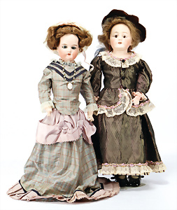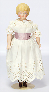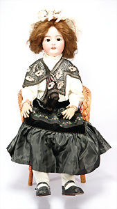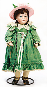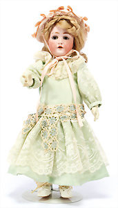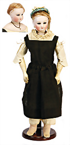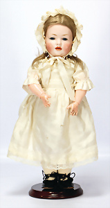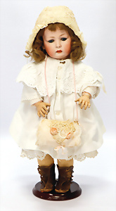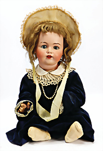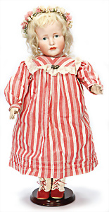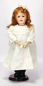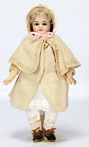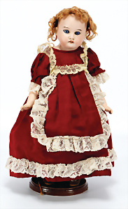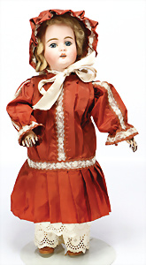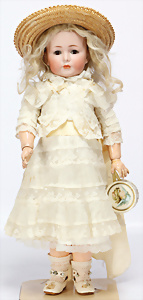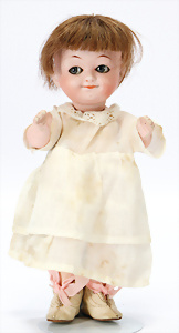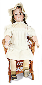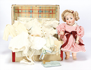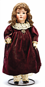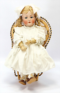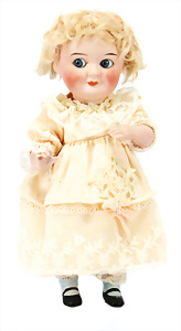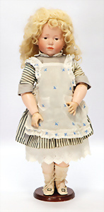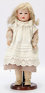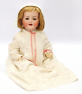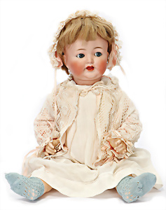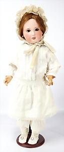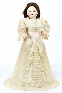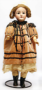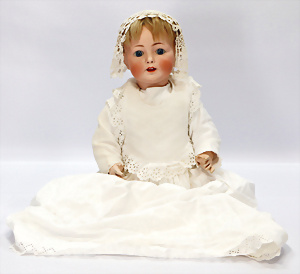164, Biskuit-Porzellankopf-Puppe, 74 cm, Kurbelkopf, blaue Schlafaugen, off. Mund, Zähne u. Zunge, Kinngrübche, Orig.-Mohair-Perücke etwas ausgegangen, Orig.-Gipsdeckel wurde nicht entfernt, von außen keine Risse erkennbar, Gliederkörper in gutem Zust., einwenig Farbunterschied an den Händen, alte Unterkleidung