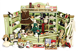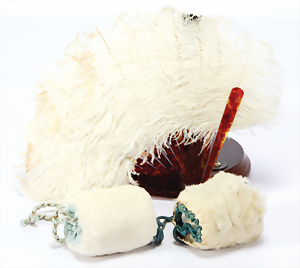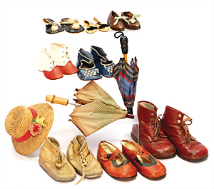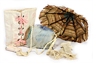 Konv. für Mode-Puppen, kl. Federmuff, 1 Puppenmieder, 1 Schirm, 18,5 cm, Griff Bein