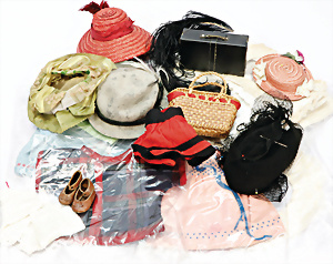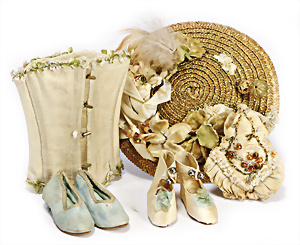 Konv. Puppen Ausschmückungsteile für Mode-Puppen, Mieder, Puppen-Hut, 2 Paar Schuhe mit Absatz, 5 u. 5,5 cm, kl. Puppentasche