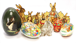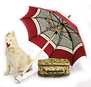 Puppenschirm, Griff Porzellan, 34 cm, kl. Puppentasche, Papiermaché mit lithogr. Papier beklebt (Candy Container), 1 kl. Fell-Hund