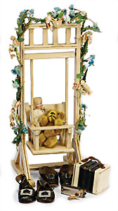 Konv. Puppen Ausschmückungsteile, 2 Paar Puppenschuhe, 5,5 cm, Kleinteile, kl. Puppe, kl. Schaukel, Holz, 26 cm