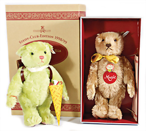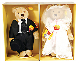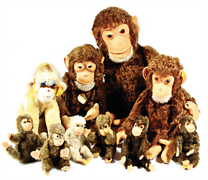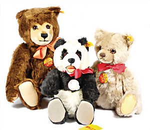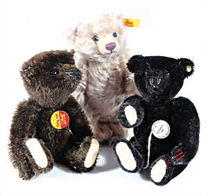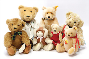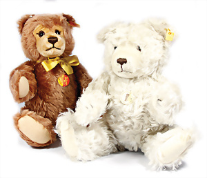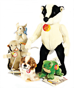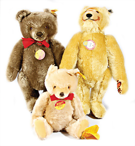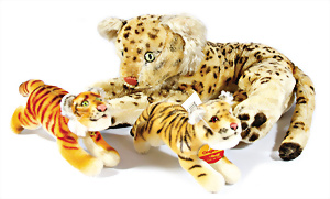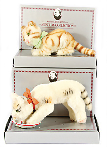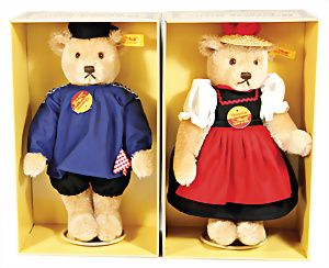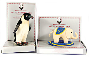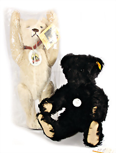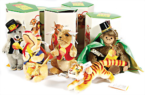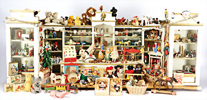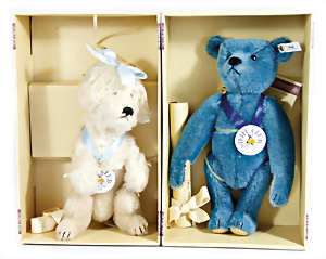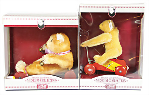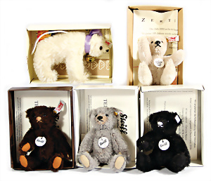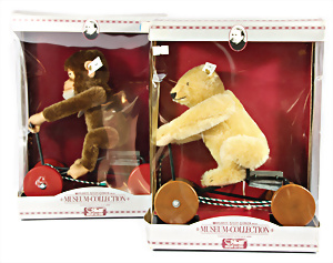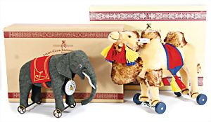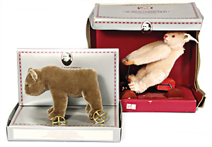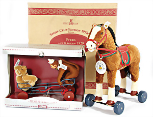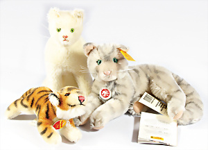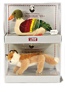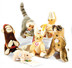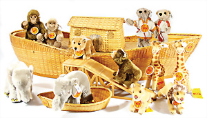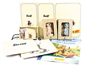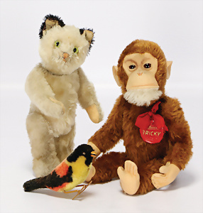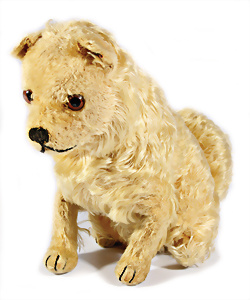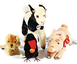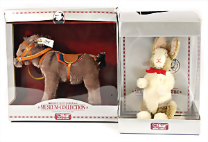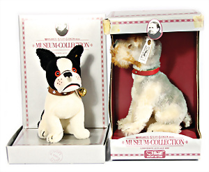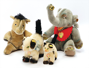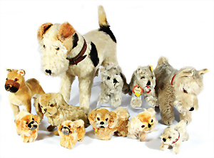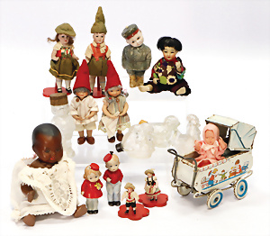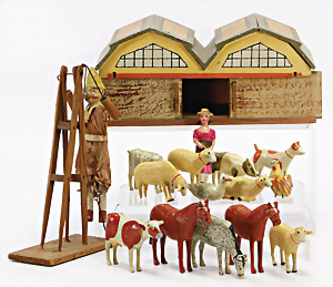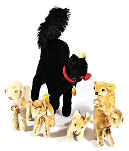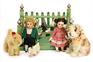 Kl. Stall mit Kunststoff- u. Celluloid-Tieren, 2 Ganzbiskuit-Puppen, Alter?, 1 STEIFF Molly, kompl. gelbe Fahne, Nr. 3310.00, 1 STEIFF Schnauzer