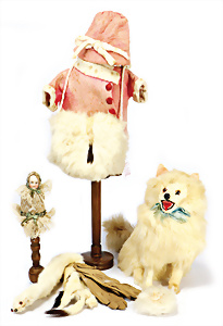 Fellhund, 20 cm, kl. Puppen-Schneiderbüste, jünger, Handschuhe, Kleidung