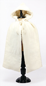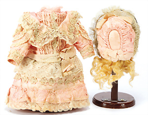 Alte Mohair-Perücke mit Papiermaché-Kopfdeckel, D: 7 cm, 1 Puppenkleid mit Haube und Unterkleid für franz. Bébé, für ca. 34-36 cm Puppe, kl. Stellen altersbed. etwas verschlissen, insgesamt schöner Orig.-Zust.