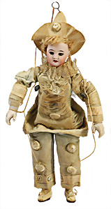 Harlekin-Puppe, Biskuit-Kopf, fest eingesetzte braune Glasaugen, off. Mund, oben Zähne, Holz-Draht-Stoff-Körper, Porzellan-Unterarme, Seide altersbed. teilw. verschlissen, 34 cm