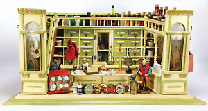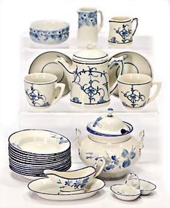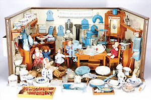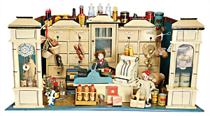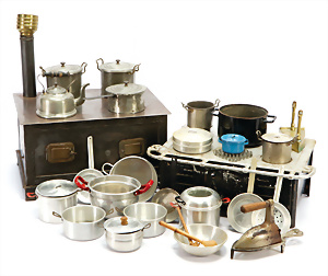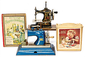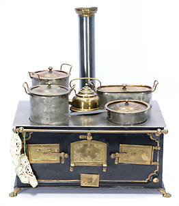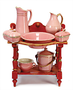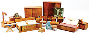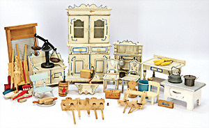 Puppen-Waschtisch, H: 25 cm, mit Waschbecken, Krug, Eimer, Nachttopf, Seifendosen, Farbabrieb am Holz, Orig.-Zust.