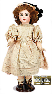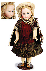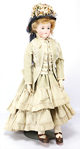 Gem. DEP 14, 74 cm, Kurbelkopf, blaue fest eingesetzte Glasaugen, off. Mund, oben Zähnem franz. Gliederkörper, alte Kleidung, Schuhe u. Strüpfe, Körper in sehr schönem Zust., alte Echthaar-Perücke