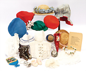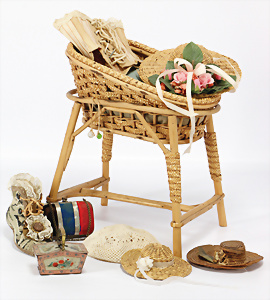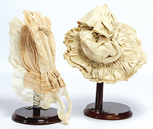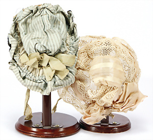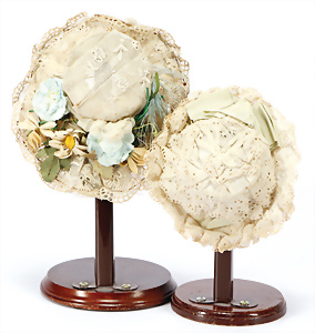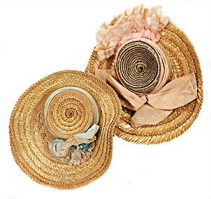 2 Teile Puppen-Hüte für Puppen mit Kopfdurchmesser 9 u. 11 cm, um 1900