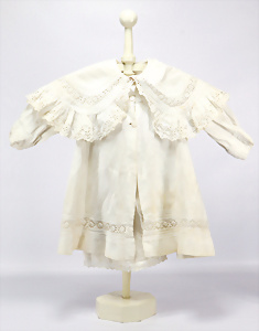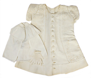 3 Teile Puppenkleidung, ca. 1890, Frankreich, für ca. 34 – 40 cm Puppe, teilw. ausgeblichen, kl. altersbed. Fehlstellen