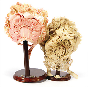 2 Teile Puppenhauben, Baumwolle, Seide u. Spitze, vor 1900, für Kopfumfang 9 u. 12 cm
