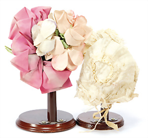 Puppenhut Filz, mit Stoffblüten für Kopfdurchmesser 10 - 12 cm, 1 Puppenhaube für Kopfdurchmesser 13 cm, um 1900