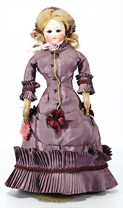 Mode-Puppe, Frankreich, Fashion-Doll, 40 cm, Biskuit-Kurbelkopf, blaue fest eingesetzte Glasaugen, geschl. Mund, auf Biskuit-Brustblatt, Haarriss auf der Stirn sowie seitl., Lederkörper, alte Kleidung, Mohair-Perücke stärker ausgegangen