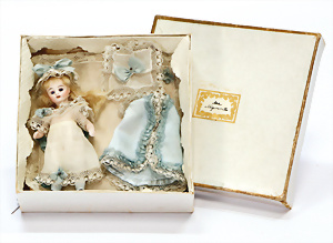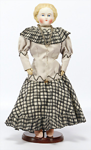 Biskuit-Porzellankopf-Puppe, Frankreich, gem. E2D Déposé, 27 cm, Kurbelkopf, blaue fest eingesetzte Glasaugen, geschl. Mund, durchst. Ohren, Riss auf der Stirn, franz. Gliederkörper mit festen Handgelenken, Kleidung aufwendig genäht, alte Echthaar-Perücke