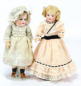 3 Teile Puppen, ALT, BECK & GOTTSCHALK, 1361, Gr. 55, Charakter-Baby, braune Schlafaugen, off. Mund, Zähne u. Zunge, durchst. Nasenlöcher, Sitzbaby-Körper mit untersch. Handhaltung u. leicht abstehendem Zeh, alte Mohair-Perücke, FRANZ, SCHMITT & CO., 1272-50, blaue Schlafaugen off. Mund, Zähne u. Zunge, durchst. Nasenlöcher, alte Echthaar-Perücke, Sitzbaby-Körper, Hände überstrichen, Charakter-Puppe, gem. 267.2., Perücke neuer, Toddler-Körper, 45 cm