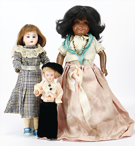 3 Teile Puppen, AM, 570, farbige gespritzte Porzellankopf-Puppe, 27 cm, HEUBACH 342, 36 cm, Perücke wurde nicht entfernt, Hände bestoßen, Kopf konnte nicht ausgeleuchtet werden, AM 390, 60 cm, Körper teilw. übermalt, Farbunterschiede, alte Echthaar-Perücke
