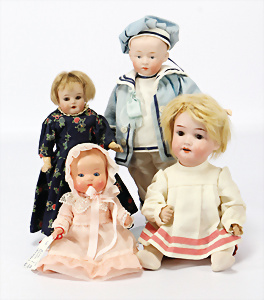 Konv. Puppen, K&R 126, 62 cm, blaue Schlafaugen off. Mund, Zähne u. Zunge, Sitzbaby-Körper mit eingebauter Stimme, schöne Gr., Haarriss am Hinterkopf, Biskuit-Porzellankopf-Puppe, HEUBACH 250, einfacher Gliederkörper, lange Oberschenkel, 53 cm, Einbindekopf-Baby, Vollkopf, blaue Schlafaugen, Masse-Puppe SONNEBERG, Stoffpuppe, BAEHR & PROESCHILD, 624, kl. Charakter-Baby, 28 cm, blaue Schlafaugen, schönes Konv.