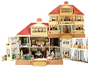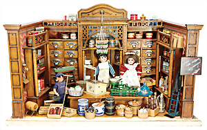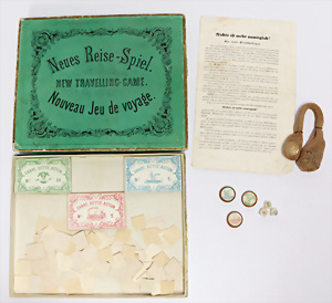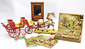Pferdegespann, Holz farbig gefasst, 67 cm, 1 Puppenschrank, 1 Würfel-Legespiel, kl. Waage