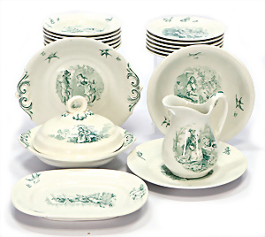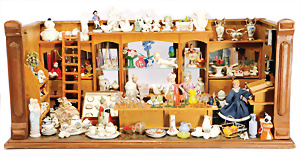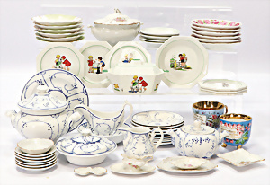 Konv. 13 Teile, Reifen-Tieren, Bauernhof, 1 Masse-Magd, Füße vorne weggebrochen, Tiere gut, H: 7 cm, 1 Turner, Masse-Crepe-Kleidung, Clown, 1 Flugzeug-Hangar, 1 Seite seitl. fehlt