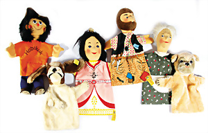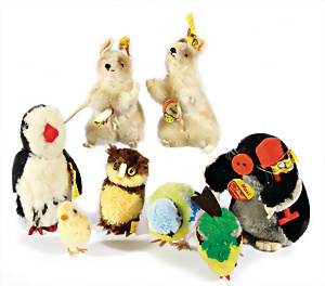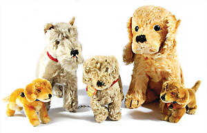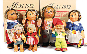 2x Däumelinchen, bespielt, Farbabrieb an einigen Stellen im Gesicht, 1x Nase etwas ausgebessert, dazu 2 kl. Fellhunde
