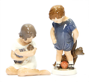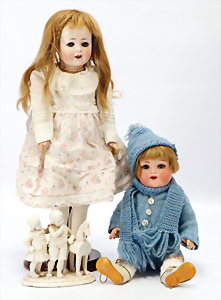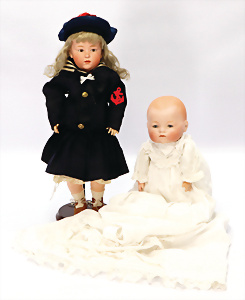 Harald, gem. 4, Vollkopf, modell. Frisur, gemalte Augen, geschl. Mund, Farbe stark abgerieben, auf Stoffkörper, Masse-Arme, 1 Daumen weggebrochen, 38 cm, Kleidung aus alten Stoffen nachgenäht, dazu kl. AM Vollkopf-Baby, dunkel gespritzt, gem. 353, braune fest eingesetzte Glasaugen, geschl. Mund, auf Masse-Stehbaby-Körper, Rissbildung am Körper, Fußspitzen bestoßen, 18,5 cm