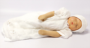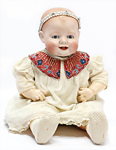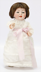 211, Biskuit-Porzellan-Charakter-Baby, 32 cm, blaue Schlafaugen, off./geschl. Mund, Sitzbaby-Körper mit untersch. Handhaltung u. leicht abstehendem Zeh, Orig.-Gipsdeckel wurde nicht entfernt, Echthaar-Perücke, Gummis lose