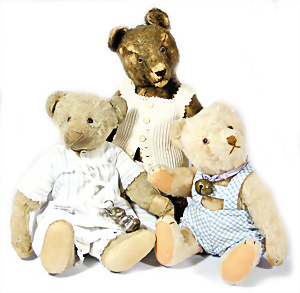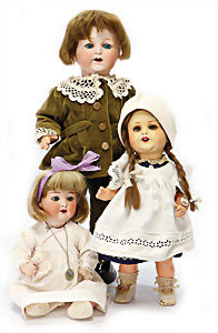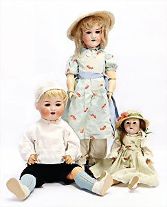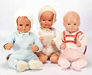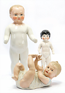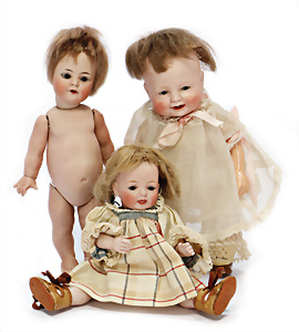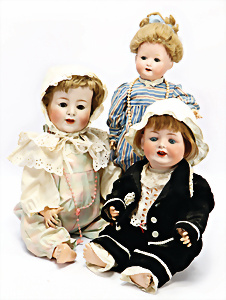 Konv. 3 Baby-Puppen, Porzellan, HEUBACH 342, 52 cm, Echthaar-Perücke, braune Schelmenaugen, off. Mund, Zähne u. Zunge, Masse-Stehkörper, GÖBEL 201, Charakter-Baby, 56 cm, alte Mohair-Perücke, blaue Schlafaugen, off. Mund, oben Zähne, Zunge, Sitzbaby-Körper, Charakter-Baby, gem. C&P 263 50, mit im Kopf eingebauter Stimme, Stimme intakt, 48 cm, blaue Schlafaugen off. Mund, Zähne u. Zunge, Sitzbaby-Körper, alte Mohair-Perücke