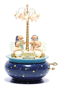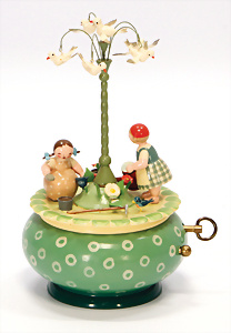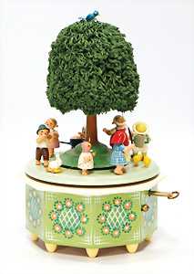 Automat, Frankreich, musizierendes Kind, H: 40 cm, Biskuit-Einbindekopf, braune fest eingesetzte Glasaugen, geschl. Mund, Biskuit-Porzellan-Arme auf Papiermaché, auf Baumstumpf sitzend, Puppe bewegt den Kopf u. spielt die Laute, Musikspielwerk intakt, Orig.-Kleidung