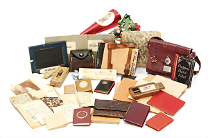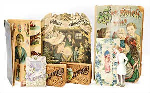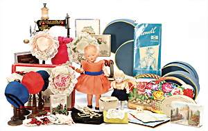 Schönes, gr. Konv. Puppenkleidung, 1900-50er Jahre, reichh., Unterwäsche, Kleidung, Schuhe, Stoffteile, bitte besichtigen, 2 Glückwunschkarten