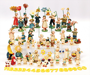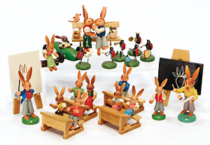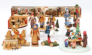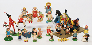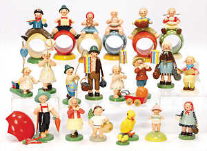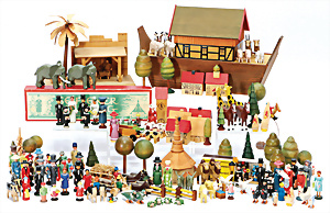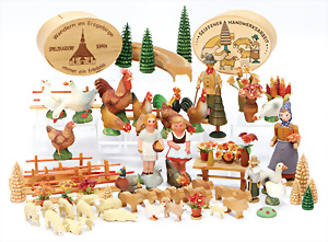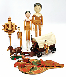 Konv. Holzspielzeug, Planwagen, pickende Hühner, Rassel, Tierpuppen, GRÖDNERTAL, 10 - 29 cm