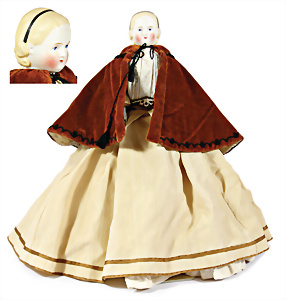 Biskuit-Porzellankopf-Puppe, K&R, 68 cm, Kurbelkopf, nachtr. fest eingesetzte blaue Glasaugen, off. Mund, oben Zähne, durchst. Ohren, Kleberreste am Kopfrand, von außen keine Risse erkennbar, Echthaar-Perücke, Gliederkörper, alte Unterkleidung, Schuhe stärker verschlissen, Kleid aus alten Stoffen genäht