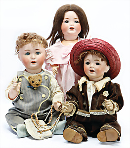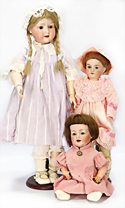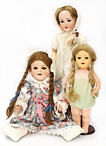 Konv. 3 Porzellankopf-Puppen, AM 390, 62 cm, Gliederkörper teilw. farbl. überarbeitet, Hände etwas zu kl., alte Mohair-Perücke, AM 990, Baby-Puppe, 59 cm, Masse-Stehkörper, Gliederpuppe mit langen Oberschenkeln, HEUBACH, Kopf restauriert, Körper etwas überarbeitet