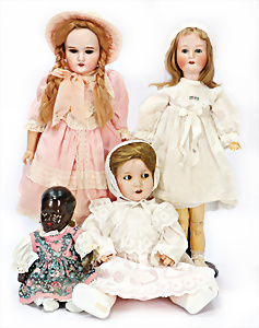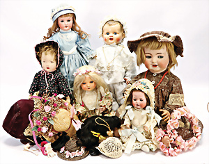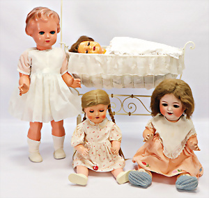 Biskuit-Porzellankopf-Puppe, HEUBACH 342, 46 cm, Kurbelkopf, blaue Schlafaugen, off. Mund, Zähne, u. Zunge, Masse-Puppe, SONNEBERG, Celluloidkopf-Puppe MIBLU, Masse-Körper, 1 Puppenwiege, 1 Puppe Kunststoff