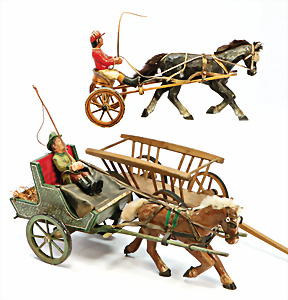 Konv. Gespanne, Holz-Sulki, 27 cm, Pferdegespann mit Bauer, 24 cm, 1 Leiterwagen mit Deichsel, 39 cm