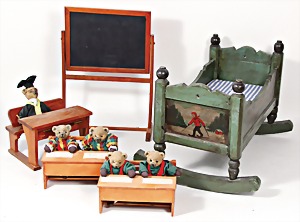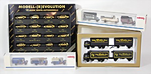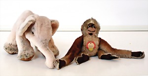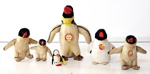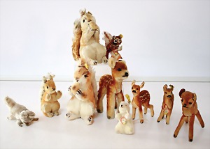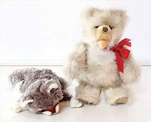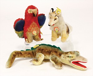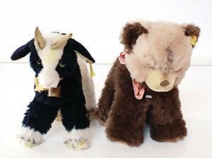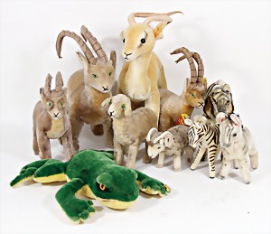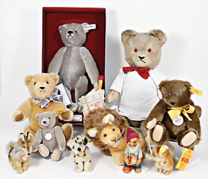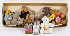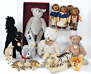 Konv. Replika Margarete Steiff, Giengen, Teddy-Bär Modell 1902, Richard Steiff, neuw. im Orig.-Kart., Micki erste Serie komplett, 17 cm, Micki, 17 cm, mit Schild, Mecki mit Knopf und Fahne, Petsy, Schild, untere Ecke fehlt, mit Knopf und Fahne, Fahne verschlissen, Katze, silberner Knopf mit Fahne Nr. 7328/0, schlafend mit Rasseln in den Tatzen, die erste Serie mit Schild, Cosy, Zotty, weiß, mit Knopf und Fahne, verschlissen, verschmutzt, Slow, komplett, Nr. auf Fahne: 2310.00, Kater komplett, Nr. auf Fahne: 7322.00, Slow, komplett, Fahne verschlissen, Zebra, komplett, Nr, auf Fahne unleserlich, schönes Konv.