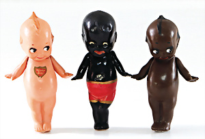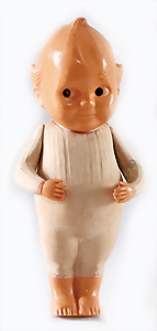 3-tlg., Celluloid-Kewpies, weißes u. farbiges Kewpie, 12 cm, 1x Frankreich, anmodell. Kleidung mit Biene auf dem Bauch, bestürzt schauend, bewegl. Arme, kl. Druckstelle auf der Stirn
