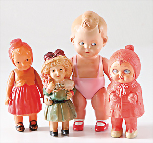 Spielkind, Celluloid, 17 cm, SiR, fester Kopf, bewegl. Arme u. Beine, teilw. ausgebessert, dazu 3 Celluloid Kinder, wohl Japan