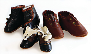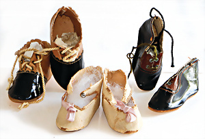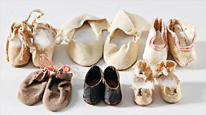 Biskuitporzellankopf-Puppe, Frankreich, 78 cm, Biskuit-Kurbelkopf, blaue fest eingesetzte Glasaugen, 1 Auge Glas geklebt, 1 Brandriss seitl., offener Mund, oben Zähne, Kinngrübchen, durchst. Ohren, Gliederkörper mit festen Handgelenken, bespielt, 1 Finger ergänzt (lose), alte Unterkleidung, Schuhe und Strümpfe, Kopfdeckel fehlt