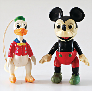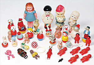 Konv. Stehauf-Figuren, versch. Hersteller, darunter Schildkröt, Hund und Elefant, 50er Jahre, 5,5 cm, Gebrüder Wolff, Hund und Ente, 6-7 cm, Paul Müller, Affe als Kofferträger, 7 cm, 1x Vogel als Dame gekleidet, kl. Auto mit Hasen-Figur, 30er Jahre, kl. Stehauf-Schweinchen, 3 kl. Teufelchen, Japan, 4 Celluloid-Figuren, Japan, 10-12 cm, schöne Ausformungen, einige Celluloid-Figürchen, 4 kl. Teufel, 3 Babys, kl. Bonzo, Japan, u.a.