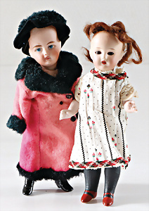 2 Teile Ganzbiskuit-Puppen, Simon & Halbig, 890, Kindergesicht, 17 cm, Kurbelkopf, braune Schlafaugen, off. Mund, 1 Puppe Petite-Francaise, Kurbelkopf, gemalte Augen, bewegl. Arme u. Beine, aufgemalte Schuhe u. Strümpfe