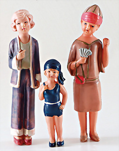 3 Teile Celluloid Figuren, Mädchen im Badeanzug, 12,5 cm, 2 Damen, 19 cm, Japan, Schirm an einer Figur fehlt, sonst gut