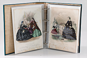 Drucke, Chromo-Lithographie, 21x14,5 cm, 20x15,5 cm, Kinderspiel-Szenen, teils handcoloriert, ca. 1870, einige Drucke Mode aus Frankreich, 34 Seiten in Schutzhülle, teilw. stockfleckig, manche Einrissstellen am Rand