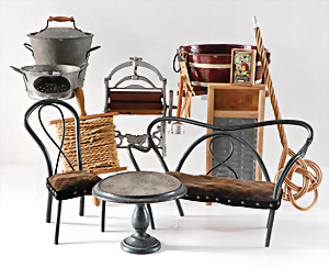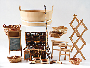 Konv. Puppendekoration, Waschset, Waschschüssel, Durchm.: 20 cm, Wäschemangel, Klopfer, Reibe, Zubehörteile, Blechschüsseln, dazu eine Sitzgruppe, wohl Tornet, Bank B: 36 cm, runder Tisch, 1 Stuhl