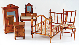 Schöne Puppendekoration, Frisiertisch mit Marmorplatte, H: 39,5 cm, Bett, 54 cm, mit Nachttisch, 1 Kleiderschrank, 1900-1910,