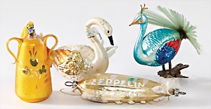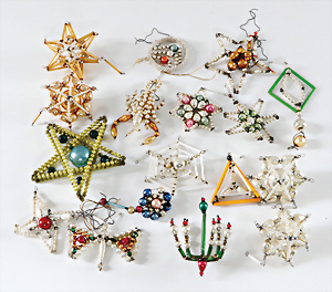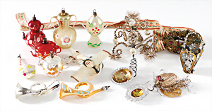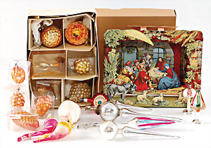 Weihnachtsdeko, Glas, 30er – 60er Jahre, Zapfen, Kugeln, Trompete, Leuchter, 4 Spitzen, 1 Blüte, 1 Aufstellgrippe neuer, schönes Konv.