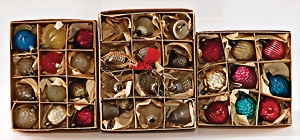 Weihnachtsschmuck, 32 Teile, wohl 30er Jahre, Zapfen, Kugeln, Früchte für kl. Weihnachtsbaum, Orig.-Verpackung