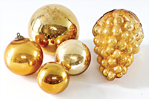 Weihnachtsschmuck, 4 Teile Biedermeier-Kugeln, Durchm. 6-10 cm, ein Traube, Glas, wohl Biedermeier, 16 cm,