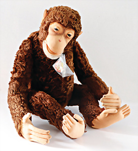 Jocko, Schimpanse, Nachkrieg, mit Knopf, Schild altersbed. verschlissen liegt lose bei, 80 cm, außergew. Gr., Filz an einem Zeh sowie einem Finger offen, Mohair gut