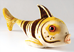 Fisch, Nachkrieg, Flossy, 65 cm, mit Knopf, Kratzer auf den Glasaugen, leicht bespielt, außergew. Gr.