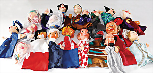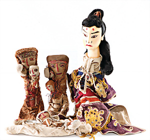 Asiatische Handspielpuppe, Holz, farbig gefasst, aufw. gearbeitete Kleidung, dazu einige afrikanische Lumpenpuppen